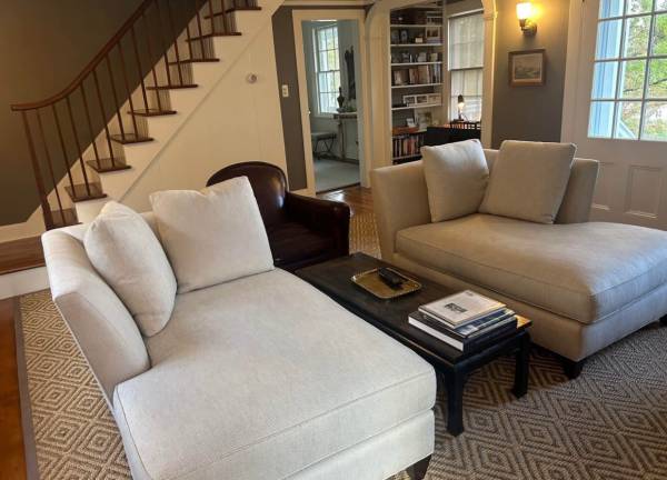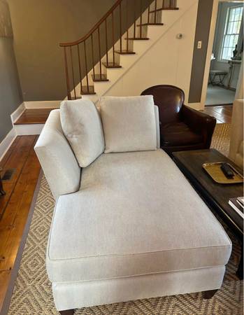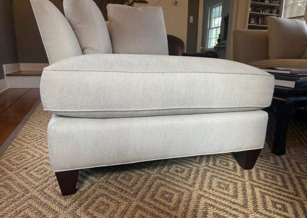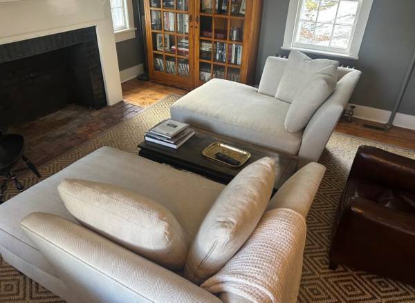 Two Shelter chaise lounge chairs. 200$ per chaise. 60”in length, 42”wide and 34”in height, 20”seat height. Two pillows on each chaise 20” x20”. Seat depth 30”. Needs 12 yards per of fabric if...