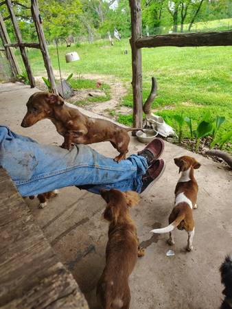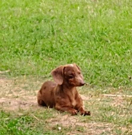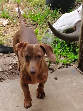1 yr old miniature chocolate dapple daschund female. Has not had puppies and is Not fixed no papers. Rehoming fee of 4 zero zero is required. TEXT ONLY no scams no codes