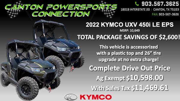 ‼️NEW 2022 KYMCO UXV450i LE EPS‼️ TOTAL PACKAGE SAVINGS OF $2,600! Vehicles are accessorized with a plastic top and 26" tire upgrade at NO CHARGE! NEW 2022 KYMCO UXV450i LE EPS (Black or Green) Ag...
