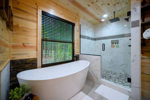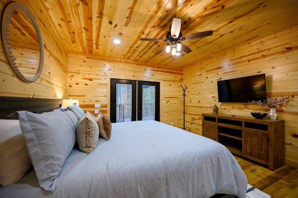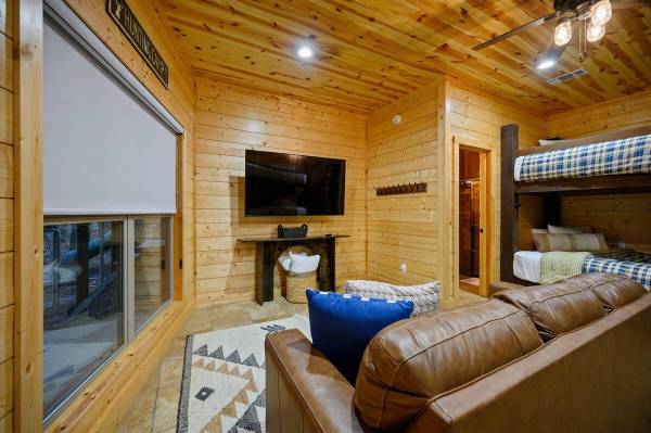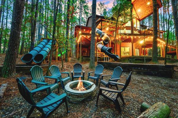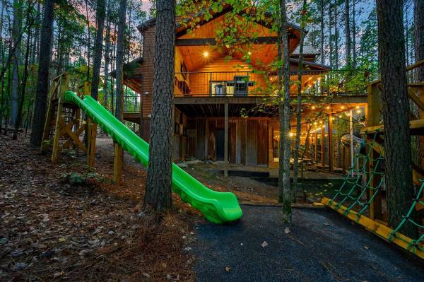 Escape to Towering Pines—a luxury cabin on 1.5 secluded acres with stunning National Forest views and direct access to ATV trails. This retreat features a 22 ft. slide from the driveway leading to a climbing platform with two 11 ft. tube slides down to the backyard. Inside, enjoy three master suites, a bunk room, game room with an arcade, pool table, and more. Outdoors, relax in the hot tub, gather by the fire pit, or explore the treehouse and play areas. Perfect for family adventures!